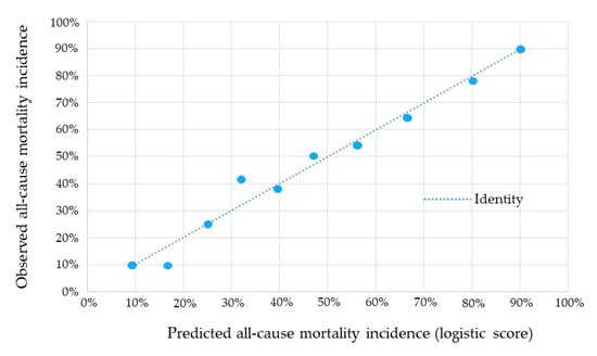 Cross-validation analysis showed high reproducibility of the score, with a mean AUC for long-term mortality of 0.79 (95% CI 0.72–0.85; p < 0.0001). The concordance between the long-term mortality predicted by the score and that observed in the entire population, stratified by deciles of risk, is reported in Figure 3.