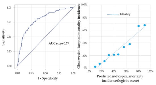 Left panel: receiving operating characteristic curve and corresponding area under the curve (AUC) for in-hospital mortality prediction of the risk score. Right panel: concordance between the in-hospital mortality incidence predicted by the score and that observed in the entire population, stratified by deciles of risk.