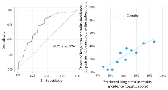 In-hospital mortality of our study population was 34% (n = 160). When also patients discharged from the index hospitalization were considered (n = 305), the median long-term follow-up was 6.9 (5.2–11.7) years. The mortality rate of discharged patients was 40% (n = 121), with a yearly mortality rate of 7%. When the score developed for the primary endpoint was applied to in-hospital mortality, its AUC was 0.79 (95% CI 0.74–0.83; p < 0.0001) (Figure 4, left panel).