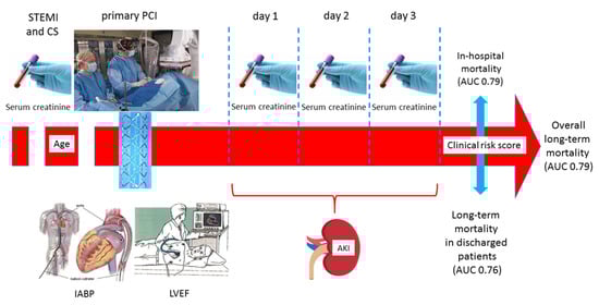 Schematic representation of the clinical score calculation in ST-segment elevation acute myocardial infarction (STEMI) patients with cardiogenic shock (CS) for in-hospital and long-term mortality prediction. AKI = acute kidney injury; AUC = area under the curve; IABP = intra-aortic balloon pump; LVEF = left ventricular ejection fraction; PCI = percutaneous coronary intervention.