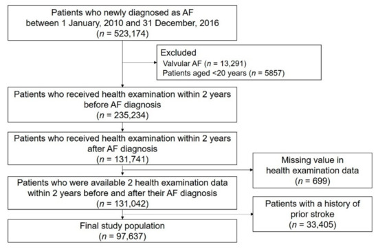 - Choi, S.; Chang, J.; Kim, K.; Kim, S.M.; Koo, H.Y.; Cho, M.H.; Cho, I.Y.; Lee, H.; Son, J.S.; Park, S.M.; et al. Association of smoking cessation after atrial fibrillation diagnosis on the risk of cardiovascular disease: A cohort study of South Korean men. BMC Public Health 2020, 20, 168. [Google Scholar] [CrossRef] [PubMed]