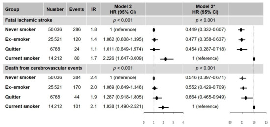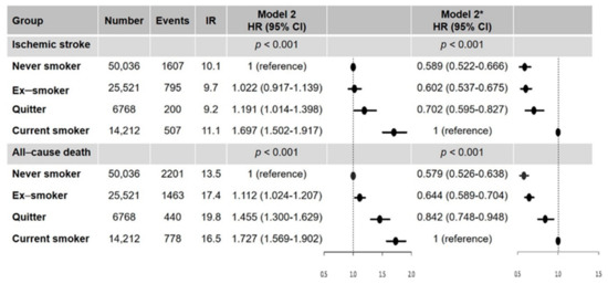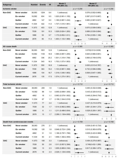 3.1.1. Ischemic Stroke and All-Cause Death Stratified by Smoking Status