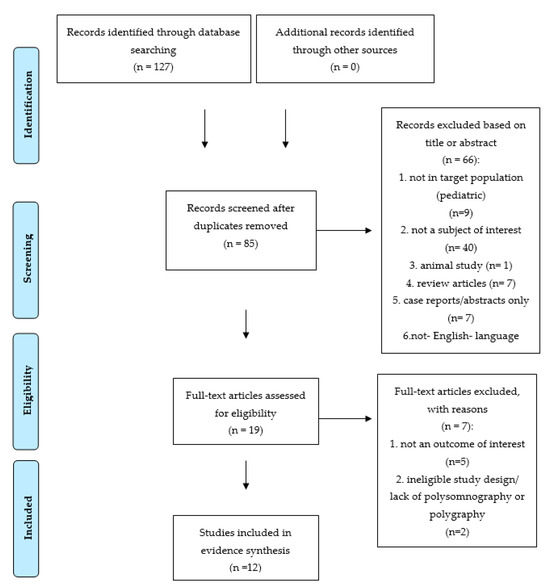 This systematic review’s authors followed the Preferred Reporting Items for Systematic Reviews and Meta-Analysis (PRISMA) Checklist [22,23]. Only studies involving human adult sleep bruxers published in English language were included. The literature screening procedure was conducted with PRISMA guidelines; details are presented in the PRISMA flowchart in Figure 1. For the current systematic review, the search strategy included search terms as follows: sleep bruxism and (cardiovascular or sympathetic activity). The literature review was performed by three authors (M.M.-Z., H.M. and M.W.) who reviewed the Embase, PubMed (MEDLINE) and Scopus databases (access date 15 April 2021). A total number of 127 reports were found. Search results estimated 22 records in the Scopus database, 76 in Embase and 29 results in PubMed. Subsequently, duplicates were removed, and thorough screening of the titles and abstracts of the remaining articles was performed. The remaining 19 full-text records were analyzed for eligibility by two authors (M.M.-Z. and H.M.) independently. Finally, 12 manuscripts were included in the synthesis (see Table 1).