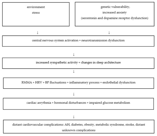 Overall, on the basis of the results of the current review, we speculate that environmental factors and genetic vulnerability to stress and anxiety may constitute the origin of the vicious cycle. Subsequently, the central nervous system is activated in response to chronic stress, affecting neurotransmission and hormonal regulation. Increased autonomic nervous system tone influences sleep architecture, leading to arousals and subsequent RMMA events. Sustained dysregulation and sleep reduction promote the production of free radicals, sympathetic activity, and subsequently, endothelial dysfunction and its consequences: heart rate variability, blood pressure fluctuations and metabolic disturbances. These may constitute risk factors for cardiovascular and metabolic diseases in the future: cardiac arrythmias, hypertension, coronary artery disease, insulin resistance or diabetes. The potential effect on general health condition may also include risk of obesity and metabolic syndrome, so-called civilization diseases. This component of a positive feedback loop accelerates CV disease development. Taking into consideration this domino effect, this is an interesting topic for new multidisciplinary approaches.