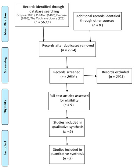 A narrative investigation of PubMed, Embase, Scopus, and Cochrane Collaboration of Systematic Reviews produced 5633 potentially eligible studies. We used EndNote X9 to remove duplicated studies (2699). The remaining 2934 studies were then read by two independent researchers. A total of 2925 studies were excluded due to not matching the selection criteria. In the end, nine studies were included in the review [8,21,22,23,24,25,26,27,28].