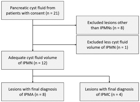 A total of 21 pancreatic cyst fluid samples were sampled during the study period. Of these, 13 lesions were diagnosed as IPMNs, including intraductal papillary mucinous adenoma (IPMA) and intraductal papillary mucinous carcinoma (IPMC), by histological validation of surgical specimens or the definition of IPMN, described below. A minimum of 600 μL fluid was needed for comprehensive analysis of miRNA; therefore, one sample with a volume less than 600 μL was excluded. The remaining 12 specimens were included in the present study to investigate the possibility of miRNAs in cyst fluid as diagnostic markers to predict malignant transformation of IPMN (Figure 1).