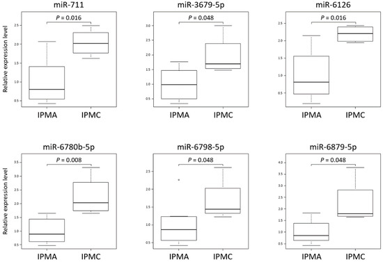 Statistical analyses were conducted using R ver. 3.3.1 (R Foundation for Statistical Computing; http://www.R-project.org/, accessed on 14 February 2018). The miRNA data were analyzed using the Mann–Whitney U test with a false discovery rate <10% after quantile normalization. A paired analysis between the groups was performed using the Mann–Whitney U test. Data are expressed as box-and-whisker plots with median values. Boxes extend from the 25th to the 75th percentile of each group’s distribution of values. Vertical extending lines mean adjacent values, i.e., the most extreme values within a 1.5 interquartile range of the 25th and 75th percentile of each group, and values beyond these upper and lower bounds are considered outliers. A p-value < 0.05 indicated a significant difference between the groups.