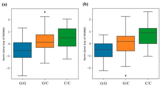 Rs4496586 genotype and MANBA gene expression association in human kidney tubules (a) and glomeruli (b). The data are from the Human Kidney eQTL database (http://susztaklab.com/eqtl (accessed on 13 April 2021)). MANBA gene expression for the rs4496586 genotype in tubules (β = 0.636, p = 1.44 × 10−6) and glomeruli (β = 0.609, p = 2.49 × 10−6) was confirmed and statistically significant. p-value was calculated by linear regression. Center lines show medians, box limits indicate 25th and 75th percentiles, and whiskers extend to the 5th and 95th percentiles, outliers are represented by diamonds.