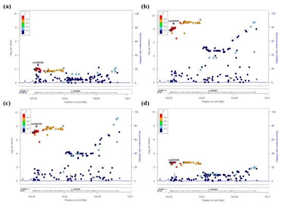 Regional plots of the association results of MANBA SNPs with CKD (a) and kidney function-related traits such as eGFR (b), creatinine (c), and uric acid levels (d) in the HEXA cohort. The statistical significance (−log10 p-value) of the analyzed SNPs is plotted. The colors indicate the linkage disequilibrium (r2) between rs4496586 and the remaining SNPs. The genetic recombination rates are shown on the right y-axis. The plots were generated by the LocusZoom program (http://csg.sph.umich.edu/locuszoom (accessed on 13 April 2021)).