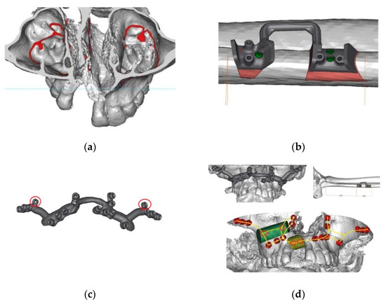 Examples of 3D-VSP planning and the design of custom guides and implants: (a) 3D reconstruction of the cleft right alveolus and maxilla, (b) guide for free fibula flap osteotomies, (c) customized fixation plate for bone graft fixation with simultaneous Le-Fort I osteotomy conceptualization and visualization. (d) Plan of the reconstructed maxilla with grafts and custom plates. (KLS Martin, Group, Tuttingen, Germany).