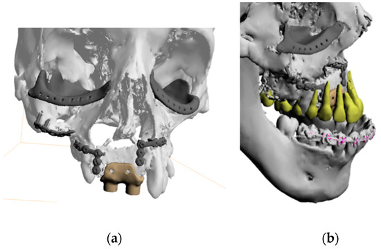 (a) 3D-VSP planning and the design of custom guides for dental implant placement. (b)Partial resorption of the graft resulted in insufficient bone volume for proper placement of dental implant that would provide physiological prosthetic reconstruction. 3D VSP provided information of re-augmentation necessity before final surgical correction of malloclusion by Le- Fort I advancement after dental implant placement (Patient 25, Table 1) (KLS Martin, Group, Tuttingen, Germany).