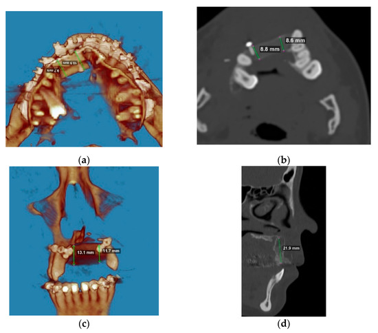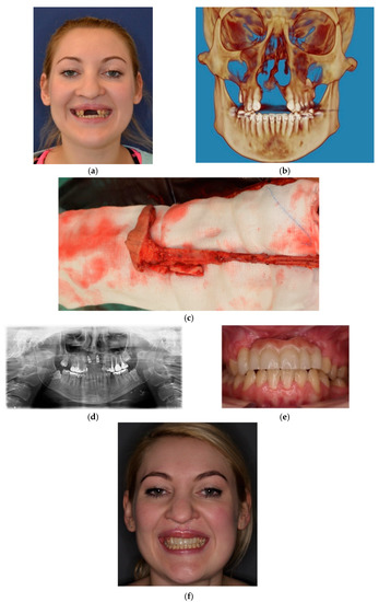 - Duskova, M.; Kotova, M.; Sedlackova, K.; Leamerova, E.; Horak, J. Bone Reconstruction of the Maxillary Alveolus for Subsequent Insertion of a Dental Implant in Patients with Cleft Lip and Palate. J. Craniofacial Surg. 2007, 18, 630–638. [Google Scholar] [CrossRef] [PubMed]