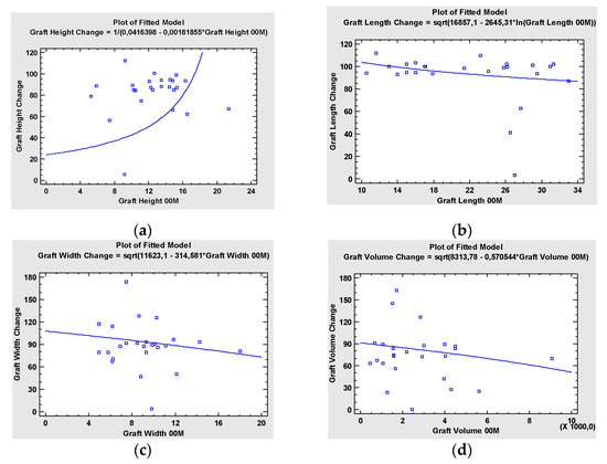 Simple regression Graft Height Change vs. Graft Height (a) showing insignificant levels of graft resorption in the horizontal dimension (height), p = 0.385; Simple regression Graft Length Change vs. Graft Length (b) showing insignificant levels of graft resorption in the sagittal dimension (length), p = 0.627 and Simple regression Graft Width Change vs. Graft Width (b) showing insignificant levels of graft resorption in the axial dimension (width), p = 0.862. Overall volume loss of the graft was insignificant at the follow ups: Simple Regression—Graft Volume Change vs. Graft Volume, p = 0.645. Figures (c,d) showing statistically insignificant changes of graft width and volume change with time.