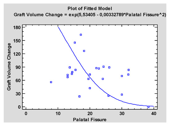 Simple Regression—Graft Volume Change vs. Palatal Fissure, indicating a moderately strong relationship between the variables.