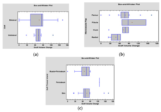 (a) Kruskal–Wallis Test for Graft Volume Change by Cleft analysis indicating insignificant correlation between type of cleft and graft bone volume loss (p = 0.5), (b) analysis of variances (ANOVA) showing that eventual bone resorption did not correlate with type of the flap used for the reconstruction (p = 0.299), (c) Kruskal–Wallis Test for Graft Volume Change by Cleft analysis, indicating insignificant correlation between the type of soft tissues island and graft bone volume loss (p = 0.378).