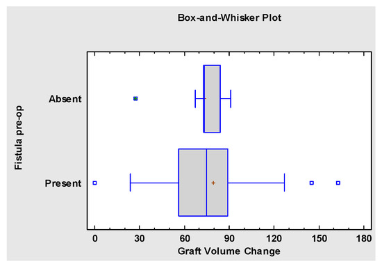 The preoperative presence of the oronasal fistula did not affect the outcome of the graft healing and did not impact the post-operative graft bone volume loss (p = 0.867) (Figure 7).
