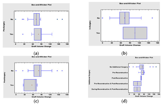 ANOVA Table for Graft Volume Change by: (a) Pre-Surgery indicating insignificant correlation between graft bone loss and presence of surgical procedures performed before final cleft reconstruction, e.g., LF1 osteotomy, LF1 osteotomy + TPD, BIMAX, Genioplasty (p = 0.6190), (b) In-surgery indicating insignificant correlation between graft bone loss and necessity of simultaneous operation, e.g., LF1 osteotomy, BIMAX (p = 0.1957) and (c) Post-surgery indicating insignificant correlation between graft bone loss and surgery performed after the reconstruction, e.g., additional bone graft, cleft rhinoplasty, LF or maxilla distraction (p = 0.1641), (d) Summary Statistics for Graft Volume Change ANOVA showing a between-group statistically insignificant (p = 0.6681).