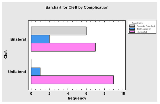 - Borba, A.M.; Borges, A.H.; da Silva, C.S.V.; Brozoski, M.A.; Naclério-Homem, M.D.G.; Miloro, M. Predictors of complication for alveolar cleft bone graft. Br. J. Oral Maxillofac. Surg. 2014, 52, 174–178. [Google Scholar] [CrossRef]