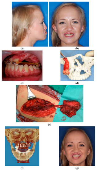 Photographs of patient treated due to bilateral cleft CSD and secondary acquired critical size deformation of the cleft maxilla: (a,b) pre-operative photographs, (c) cleft deformity and critical size defect requiring composite reconstruction, (d) intraoperative pre-maxilla resection, (e) prepared ICF flap on vessel peduncle prior harvesting and implantation, (f) dental implants placed 6 months after reconstruction, (g) final prosthetic reconstruction.