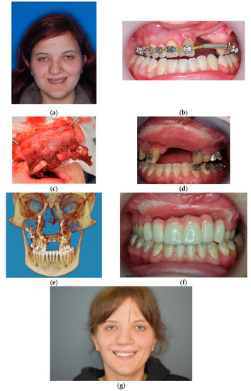 Photographs of a patient treated due to unilateral cleft CSD and secondary deformation of the cleft maxilla: (a) pre-operative photograph and (b) cleft CSD, (c) intraoperative placement of the FFF flap, (d) healed donor site, (e) 3D reconstruction of the operated CSD (f) final implant supported prosthetic superstructure, (g) facial appearance of the patient after full reconstruction of the cleft maxilla.
