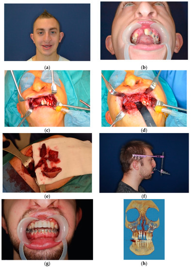 Photographs of a patient treated due to unilateral cleft CSD and secondary deformation of the cleft maxilla: (a) pre-operative photograph and (b) cleft CSD, (c) intraoperative preparation of the donor site and necessity of premaxilla resection due to bone deficiency around roots of the anterior teeth (d), (e) preparation of MFCFF flap, (f) Le Fort I osteotomy and anterior distraction of the graft with placed implants performed 6 months after first reconstruction, (g) final implant supported prosthetic superstructure, (h) 3D reconstruction after full reconstruction of the cleft maxilla.