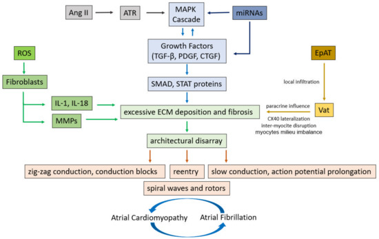Cellular and molecular pathways involved in the structural and electrical remodeling leading to atrial fibrillation. Ang II = Angiotensin II, ATR = Angiotensin receptor, MAPK = mitogen-activated protein kinase, TGF-β = Transforming growth factor-β, PDGF = platelet derived growth factor, CTGF = connective tissue growth factor, SMAD = Small mothers against decapentaplegic, STAT = signal transducer and activator of transcription, ROS = reactive oxygen species, IL-1 = interleukin-1, IL-18 = Interleukin-18, MMPs = matrix metalloproteinases, ECM = extra cellular matrix, miRNAs = microRiboNucleicAcids, EpAT = Epicardial Adipose Tissue, VaT = Visceral adipose Tissue.