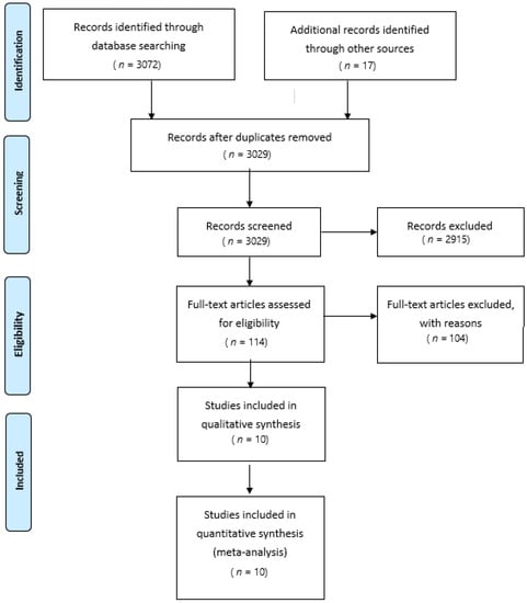 The systematic review’s flow chart is presented in Figure 1. The database search returned three thousand and seventy-two records. Seventeen records were identified through other sources (references of articles). Following elimination of duplicates, three thousand and twenty-nine abstracts were screened. Two thousand nine hundred and fifteen were excluded. One hundred and fourteen full-text publications were scrutinized. One hundred and four articles were excluded (eleven referring to ERAS protocols for living kidney donors; twenty-seven congress abstracts lacking the relevant data or presenting duplicated results; eight comments, reviews, opinion papers and protocols; three because they excluded participants with significant complications; three because they did not report relevant outcomes; one due to lack of a control group; three because they included pediatric participants; three referring to nephrectomy operations; forty-five because only a solitary intervention was reported). In total, ten studies, two randomized clinical trials and eight cohort studies were deemed eligible for inclusion in our systematic review and meta-analysis [,,,,,,,,,].