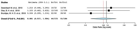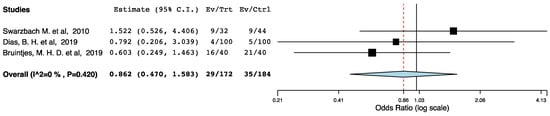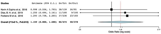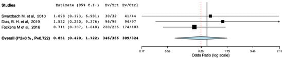 With regard to graft survival, three non-randomized studies provided follow-up data. Up to one year post-operatively, we did not find a difference in graft survival rates across the ERAS and the control groups (95CI: 0.420, 1.722) (p = 0.653) (I2 = 0%, Het p = 0.722) (Figure 10).
