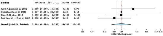 Three non-randomized studies provided data on recipients’ readmissions. As shown in Figure 9, the implementation of ERAS protocols in these studies did not result in increased readmissions rates (95CI: 0.800, 1.680) (p = 0.435) (I2 = 0%, Het p = 0.810).