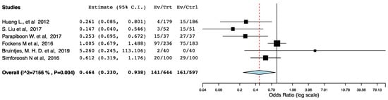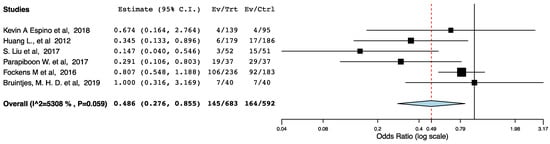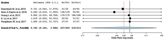 Five studies, two RCTs and three non-randomized trials reported one-year post-transplant patient survival. We did not find a difference in recipients’ one-year survival across the ERAS and the control groups (95CI: 0.162, 3.586) (p = 0.731) (I2 = 0%, Het p = 0.998) (Figure 11).