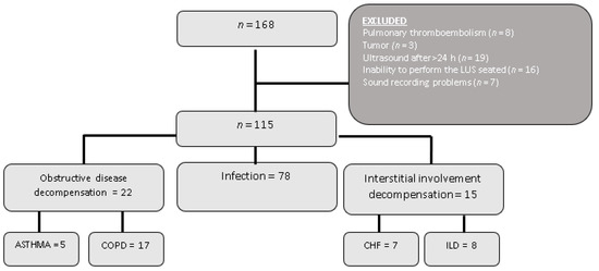A total of 168 patients were included in the study. Of these, 53 were eventually excluded due to the reasons explained in Figure 1. Therefore, a final total of 115 patients were analyzed, with 76 of them (66%) being men with a mean age of 65.47 years (95% CI:62.8–68.4). In 22 (19.1%) patients, the final diagnosis was decompensation of their underlying obstructive disease, with 17 (77.3%) of these cases corresponding to a decompensated COPD and five (22.7%) to an asthma attack. A large proportion of the patients (78; 67.8%) were diagnosed with a respiratory infection, and 15 (13%) were diagnosed with a decompensated interstitial disease.