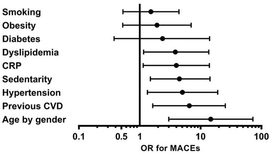 Odds ratios of presenting a major cardiovascular event during follow-up for each cardiovascular risk factor and CRP from the OSTEOVAS cohort. The multivariate analysis was adjusted for the use of glucocorticoids and cyclophosphamide. CRP, C-reactive protein; CVD, cardiovascular disease; OR, odds ratio; MACEs, major cardiovascular events; age by gender: being >50 years for men and >60 years for women.