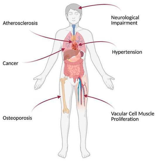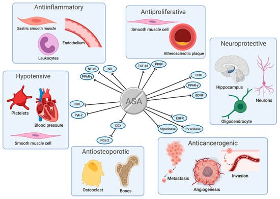 ASA improved alveolar bone defects healing in rats by impeding lipopolysaccharides (LPS)-induced macrophages via the inhibition of NF-κB pathway [30]. Moreover, ASA treatment improved the inflammatory response in cerebral infarction in mice thanks to downregulation of both TLR4 (toll-like receptor 4) and NF-κB expression, which led to endoplasmic reticulum (ER) stress inhibition [31]. Another promising target point for ASA is preeclampsia, which is known to depend on oxidative stress and inflammation via activation of NF-kB. By decreasing the translocation of NF-kB, low doses of ASA are used in preeclampsia prevention and treatment [32,33]. Also, ASA inhibits the growth and the metastasis of osteosarcoma through the NF-κB pathway [34].