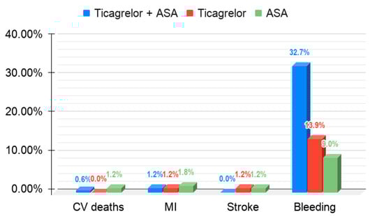 It is important to mention another antiplatelet drug with pleiotropic effects—ticagrelor, which could be combined with ASA to maximize the treatment benefits [91]. In the Dual Ticagrelor Plus Aspirin Antiplatelet Strategy After Coronary Artery Bypass Grafting (DACAB) study, 500 patients were randomized to receive ticagrelor (90 mg twice daily) + ASA (100 mg once daily), ticagrelor (90 mg twice daily), or ASA (100 mg once daily) within 24 h post-CABG. Although the combination of ticagrelor and ASA was superior to aspirin alone in maintaining the saphenous vein graft patency for up to 1 year after elective CABG, there were no differences between ticagrelor and ASA. Although the rate of cardiovascular events and bleeding events was low, the combination of ticagrelor and ASA numerically decreased the risk of the major cardiovascular events after CABG (cardiovascular death, myocardial infarction, stroke), but also increased the risk of bleeding (CABG-related, non-CABG-related, and major bleeding events) [92], compared to ASA. The main results of DACAB study are presented in Figure 3. Altogether, the combinations of ticagrelor and ASA might improve graft patency after CABG, but further studies are needed to assess the bleeding risk.