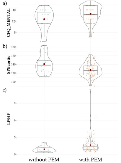 Comparison of patients with PEM vs. without PEM in the CFQ mental fatigue sub-score (a), aortic sBP (b) and sympathovagal balance (c). Red dots indicate mean value, horizontal black line inside the box denotes median value. Green dots before and orange dots after denote results of individual patients. Shape of violin graph indicates distribution of results.