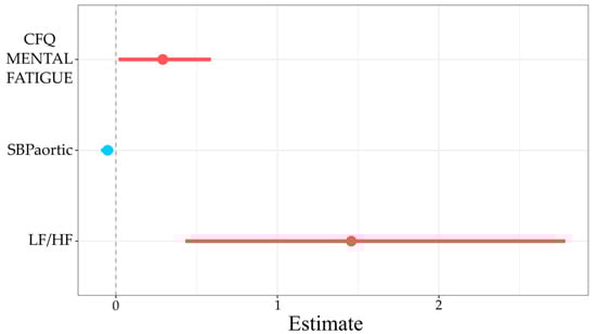 Figure 2 shows the estimate of parameters and their confidence interval (−95%, 95%) in logistic regression analysis. In terms of odds ratios, the results were as follows: for a one point more increase in the mental fatigue component of the CFQ scale, the risk of PEM increases by 34% (CI = 2%, 80%). For an aortic systolic blood pressure increase of 1 mmHg, the risk of PEM decreases by 5% (CI = 9%, 2%). For a one unit more increase in sympathovagal balance, the risk of PEM increases by 330% (CI = 50%, 1516%). (AIC = 81.18, BIC = 91.6, Tjur’s R2 = 0.26) (Table A1 in Appendix A).