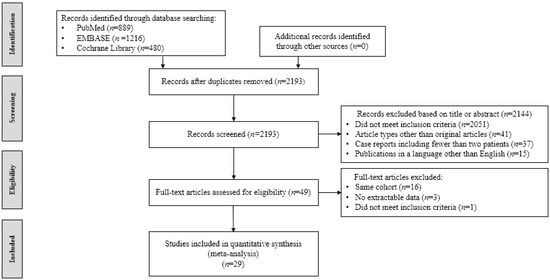 A total of 2585 studies were identified. Duplicate articles (n = 392) were excluded. Further, 2144 articles were rejected based on the title and abstracts. Forty-nine articles were reviewed. After assessing eligibility, 20 articles were excluded (as illustrated in Figure 1). Finally, a total of 29 articles were included involving 498 participants [13,14,18,22,23,24,25,26,27,28,29,30,31,32,33,34,35,36,37,38,39,40,41,42,43,44,45,46,47]