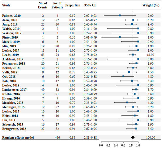Pooled estimate rate for successful closure in patients with transmural defects of upper gastrointestinal tract.
