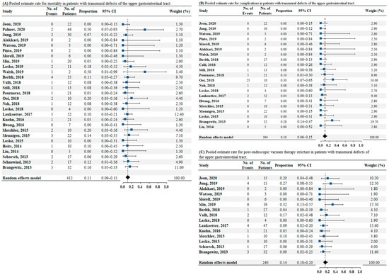 (A) Pooled estimate rate for mortality in patients with transmural defects of upper gastrointestinal tract. (B) Pooled estimate rate for complications in patients with transmural defects of the upper gastrointestinal tract. (C) Pooled estimate rate for postendoscopic vacuum therapy stricture in patients with transmural defects of upper gastrointestinal tract. Abbreviations: No, number; OR, odds ratio; CI, confidence interval.