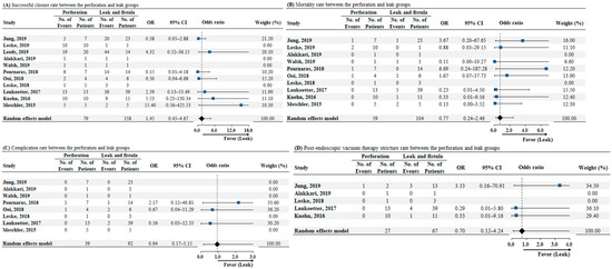 (A) Forrest plot of successful closure rate for comparison between the perforation and leak group. (B) Forrest plot of mortality rate for comparison between perforation and leak groups. (C) Forrest plot of complication rate for comparison between perforation and leak groups. (D) Forrest plot of postendoscopic vacuum therapy stricture rate for comparison between perforation and leak groups. Abbreviations: No, number; OR, odds ratio; CI, confidence interval.