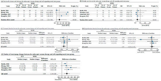 (A) Successful closure rate between endoscopic vacuum therapy and self-expanding metal stent groups, (B) Mortality rate between endoscopic vacuum therapy and self-expanding metal stent groups, (C) Treatment duration between endoscopic vacuum therapy and self-expanding metal stent groups, (D) Hospitalization duration between endoscopic vacuum therapy and self-expanding metal stent groups, (E) Number of stent/sponge changes between endoscopic vacuum therapy and self-expanding metal stent groups. Abbreviations: EVT, endoscopic vacuum therapy; SEMS self-expanding metal stent; No, number; OR, odds ratio; CI, confidence interval; QE, quantitative estimation.
