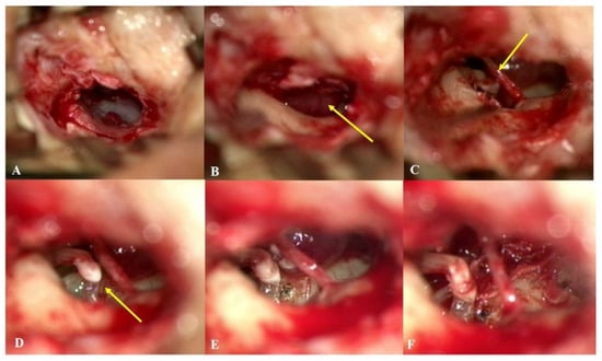 - Honkura, Y.; Hidala, H.; Ohta, J.; Gorai, S.; Katori, Y.; Kobayashi, T. Surgical treatment for the aberrant internal carotid artery in the middle ear with pulsatile tinnitus. Auris Nasus Larynx 2014, 41, 215–218. [Google Scholar] [CrossRef] [PubMed]