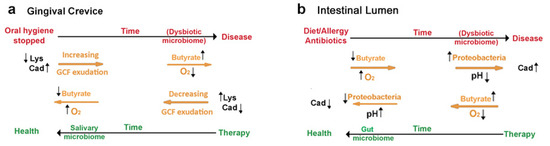 Summary: Cadaverine and butyrate production in periodontal and inflammatory bowel diseases. (a) Restricting oral hygiene converts a commensal oral microbiome into a dysbiotic one. Inadequate oral hygiene allows lysine decarboxylase from E. corrodens (LdcE) to deplete lysine from traces of an inflammatory exudate maintained by mastication, gingival crevicular fluid (GCF). GCF lysine is necessary to keep the dental epithelial attachment sealed from bacterial products, but LdcE action impairs this seal. Once impaired, the barrier cannot be re-established if oral hygiene remains inadequate, especially because GCF is a better bacterial substrate than saliva. Over time, oxygen access decreases, and the biofilm microbiome increases in mass and changes in composition. The bacteria hydrolyze GCF proteins and catabolize the amino acids to butyrate, which activates tissue destruction (periodontitis). Effective oral hygiene removes the butyrate, the dysbiotic biofilm, and the LdcE. The inflammation resolves and periodontal destruction stops. (b) Various unrelated factors convert a commensal intestinal microbiome into a dysbiotic one. Fatty diets, food allergies, autoimmune diseases, or excessive use of antibiotics irritate intestinal epithelial cell function and let oxygen into the lumen, causing a bloom of Proteobacteria that replace butyrate with lactate. The increased acidity increases bacterial production of cadaverine that protects the Proteobacteria from host leukocyte products. Treating the diet, allergic, or auto-immune diseases along with repeated intake of probiotic (butyrate-promoting) bacteria can remove the Proteobacteria and consequently the acidity and cadaverine content of the intestine. Original Figure.