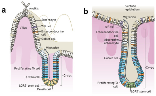 Illustrations showing the villus and crypt in the small and large intestines. (a) Small intestine. Epithelial cells of the small intestine are differentiated into nutrient-absorbing cells (enterocytes) and smaller amounts of other functioning cells [20]. These various cell types secrete mucins (goblet cells), antibacterial proteins (Paneth cells), a spectrum of biological effectors (tuft cells) [21], and gastrointestinal hormones (enteroendocrine cells). Two additional cell types, microfold cells responsible for mucosal (secretory) immunity and cup cells of unknown function, are not shown. As enterocytes (shown in white) shed, there is a reorganization of tight junction and adherens junction proteins. The former control the movement of ions and solutes between cells; the latter initiate and maintain cell-cell contacts [22]. Ejection is initiated by a procedure called anoikis, apoptosis coordinated with a signal for the adjacent enterocyte monolayer to plug the gap [23] (see top left and Section 3.2). In the crypts, LGR5+ (Leu-rich repeat-containing G protein-coupled receptor 5-expressing) stem cells (yellow) are intercalated with Paneth cells (light orange) at the crypt base (bottom right). Paneth cells contain antimicrobial peptides and immunomodulating proteins that regulate the composition of the intestinal flora. LGR5+ cells continuously generate rapidly proliferating transit-amplifying (TA) cells that occupy the remainder of a crypt and differentiate into the various functional cells listed above to replace those lost by anoikis at the villus tip. The +4 “reserve” stem cells just above the crypt base (darker blue than the proliferating TA cells) can restore LGR5+ CBC stem cells following injury. (b) Large intestine (colon). LGR5+ stem cells at the crypt base generate rapidly proliferating TA cells in the lower half of the crypt (middle panel). TA cells subsequently differentiate into the same mature lineages as the small intestine epithelium (goblet cells; enteroendocrine cells; tuft cells; and absorptive enterocytes, now generally called colonocytes). They shed from the flat surface of the colon, and complete turnover occurs every 5–7 days. Reprinted with permission from [24]. Copyright 1986 John Wiley & Sons, Inc.