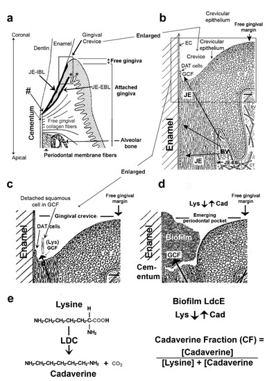 The teeth lie in alveolar bone surrounded by the periodontium, which consists of the gingiva and periodontal membrane, both composed of many large bundles of fibrous collagen surrounded by small amounts of elastic (oxytalan) fibers and other connective tissue proteins. The outer surface of the gingiva in the oral cavity is covered with a layered epithelium that everts around each tooth to forms a thin crevice, at whose base is the dentogingival epithelial attachment. Bacteria from saliva adhere to teeth surfaces and extend into the crevice above this attachment. If the teeth remain uncleaned, they induce inflammation (gingivitis), a precursor of periodontitis in which the tooth attachments migrate apically until the teeth become loose and may eventually exfoliate [1]. We have discovered that gingivitis is initiated and maintained by lysine decarboxylase from Eikenella corrodens (LdcE), an enzyme that converts lysine to cadaverine and carbon dioxide [2]. Persistent gingivitis and cadaverine protect the biofilm microbiome and change its composition into one that synthesizes butyrate and mediates periodontitis [3,4,5]. A paradox is that the same combination of bacterial products, cadaverine and butyrate, maintain a commensal (probiotic) microbiome in the intestine. Figure 1 summarizes the roles and initiating factors of cadaverine and butyrate production in periodontal and intestinal diseases.