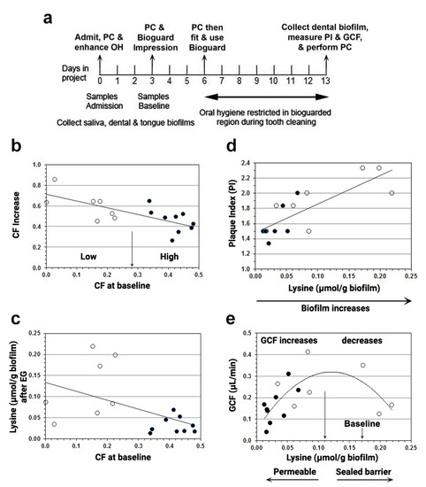 Associations of cadaverine fraction (CF) increase, biofilm lysine, biofilm accumulation, and GCF after oral hygiene were restricted for a week. (a) Summary of methods. PC = professional cleaning; OH = oral hygiene; PI = plaque index; GCF = gingival crevicular fluid. A bioguard splint was constructed to protect biofilm over an upper right or left quadrant and used only while tooth brushing during the week of EG. Note also that GCF was measured in the fluid fraction and therefore expressed per gram of biofilm (Section 2.5). (b) Increase in cadaverine fraction (CF) is inversely related to baseline CF. The central split (arrow) was determined by univariate clustering, which divided the participants into those with a small (○) or large (●) baseline CF. A large baseline CF gave a smaller CF increase. (c) Biofilm lysine content is inversely related to baseline CF. A large baseline CF resulted in less biofilm lysine (Mann-Whitney p < 0.01). (d) PI associates with biofilm lysine content. PI correlated with biofilm lysine (Lys) content after oral hygiene restriction (OHR). Spearman R2 = 0.58, p < 0.001. (e) GCF exudation rate regressed on biofilm lysine content after oral hygiene restriction. Lysine depletion increases permeability moving left to the origin from the long vertical arrow near the center of the x-axis, i.e., at 0.11 µmol lysine/g biofilm, the minimal lysine concentration of normal blood plasma, 0.11 µmol/mL [78]. The mean lysine content before oral hygiene restriction (OHR, Table 1) to the right of the long vertical arrow is indicated by the short arrow. The quadratic relationship of GCF to lysine concentration after OHR was significant: least-squares regression, R2 = 0.37, ANOVA F = 5.4, p < 0.02 (see text, Section 2.5). Adapted with permission from [73]. Copyright 2012 American Academy of Periodontology.