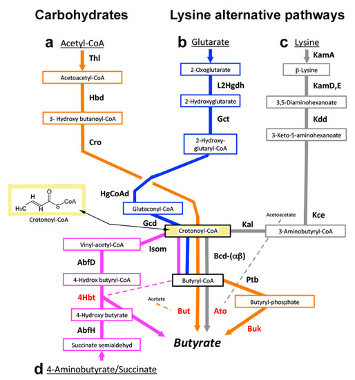 Anaerobic pathways for butyrate synthesis. Major substrates are carbohydrates and the amino acids lysine and glutamate. The common pathway: crotonyl-CoA (yellow rectangle) is common to all 4 pathways. In most bacteria, crotonyl-CoA is metabolized by the terminal genes (red) to butyryl-CoA by butyryl-CoA dehydrogenase (Bcd) acting in reverse, and then to butyrate by butyryl-CoA/acetyl-CoA transferase (But). In a few bacteria, butyryl-CoA is first phosphorylated by butyrate phosphate butyryltransferase (Ptb) and then dephosphorylated to butyrate with butyrate kinase (Buk). (a) Acetyl-CoA (orange arrows): product of carbohydrate metabolism. Acetyl-CoA is converted to crotonyl-CoA using three enzymes: thiolase (Thl), hydroxybutyryl-dehydrogenase (Hbd), and crotonase/enoyl-CoA hydratase (Cro). (b) Glutarate (blue arrows): product of lysine or tryptophan metabolism [121]. Glutarate is converted to crotonyl-CoA by 2-hydroxyglutaratedehydrogenase (L2Hgdh) followed by glutaconate-CoA transferase (Gct), 2-hydroxyglutaryl-CoA dehydrogenase (HgCoAd), and glutaconyl-CoA decarboxylase (Gcd). (c) Lysine (gray arrows): unique path; lysine is metabolized to crotonyl-CoA by lysine 2,3-aminomutase (KamA), lysine 5,6-aminomutase (KamD), 3,5-diaminohexanoate dehydrogenase (Kdd), 3-keto-5-aminohexanoate cleavage enzymes (Kce), and 3-aminobutyryl-CoA ammonia lyase (Kal). In a few bacteria, acetoacetate may also be converted to butyrate using the enzyme butyryl-CoA acetoacetate-CoA transferase (Ato). (d) 4-Aminobutyrate/succinate (purple arrows from the bottom of the figure): 4-aminobutyrate (GABA) is a product of glutamine [122], obtained by glutaminase removing the glutamine amide group to form glutamate. The glutamate amino group is removed by glutamate dehydrogenase to form succinate-semialdehyde and converted to crotonyl-CoA by 4-hydroxybutyrate-dehydrogenase (AbfH), butyryl-CoA-4-hydroxybutyrate-CoA transferase (4Hbt), and 4-hydroxybutyryl-dehydratase (AbfD). AbfD also possesses vinyl-acetyl-CoA isomerase activity (Isom). Not shown are how aspartate, arginine, and putrescine are converted to butyrate by the 4-aminobutyrate/succinate path. Aspartate is converted to succinate semi-aldehyde by three enzymes, namely, aspartate aminotransferase, fumarate transferase, and acyl-CoA transferase. Arginine is decarboxylated to agmatine, which is hydrolyzed to urea and putrescine. The putrescine reacts with ketoglutarate to produce 4-aminobutyraldehyde, which is oxidized to 4-aminobutyrate and metabolized like glutamine [123]. The common step of all four pathways is the synthesis of crotonyl-CoA, which precedes butyryl-CoA and butyrate. Adapted from [120].