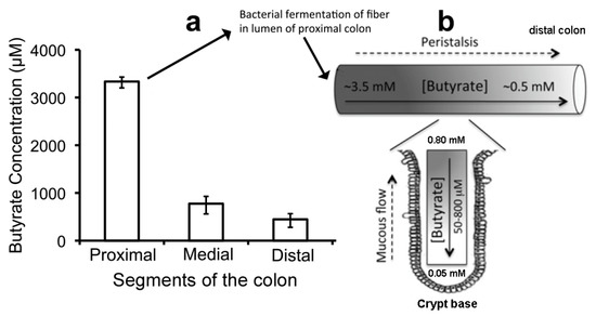 Peristalsis and butyrate concentration in the intestinal lumen. (a) Butyrate levels in the lumen of proximal, medial, and distal segments of mouse colon. (b) Model showing two butyrate gradients in the mammalian colon. The proximal-to-distal luminal gradient arises because most bacterial fermentation occurs in the proximal colon, and butyrate that is not absorbed by proximal colonocytes is pushed distally with luminal contents due to peristalsis. The luminal-to-crypt gradient also arises from peristalsis squeezing an upward flow of mucous secreted continuously into the crypt by goblet cells. Adapted with permission from [156]. Copyright 2012 Elsevier.