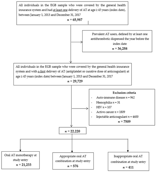 Figure 1. Flow chart. Abbreviations: EGB: échantillon généraliste des bénéficiaires (general sample of beneficiaries); AT: antithrombotics