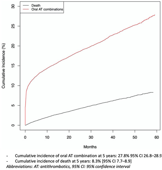 Figure 2. Cumulative incidence curves of oral antithrombotic (AT) combination and death for the whole cohort (n = 22,220), over the 5-year study.